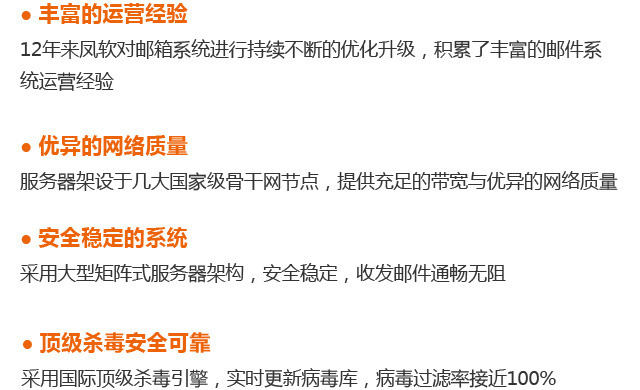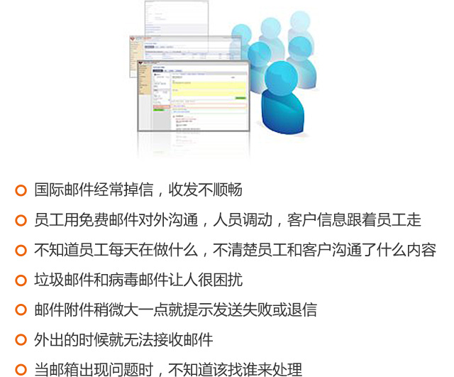 在网络时代,对于众多企业来说,邮件都是内外沟通的主要渠道之一,不论是收发订单、传送样品资料或是签订电子合同,都要依靠电子邮箱实现。随着企业发展,对电子邮箱的要求也逐渐升高,免费邮箱已经难以满足企业的沟通需求。凤软网络携企业邮箱,为您提供贴心的企业邮箱服务,帮助您解决以下邮件收发难题: